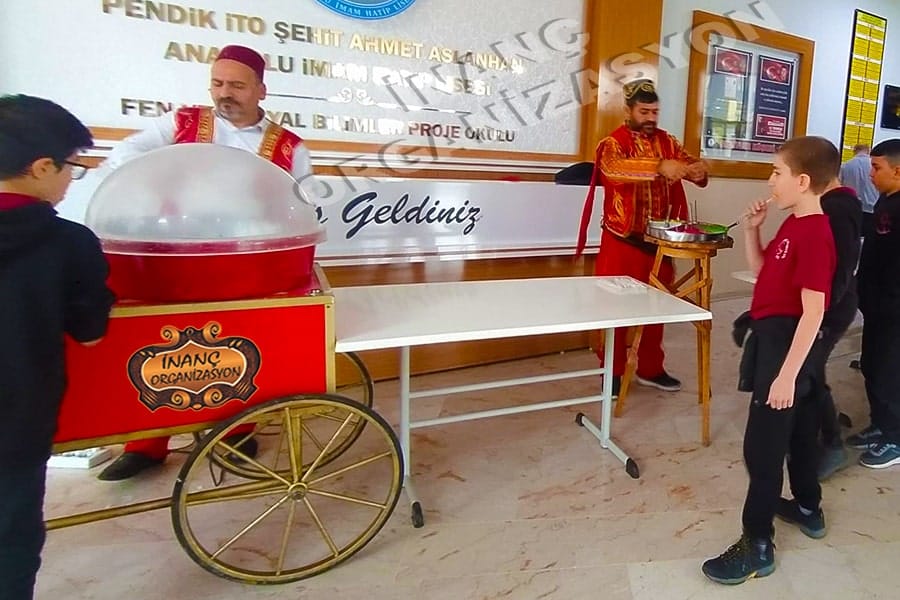 Çoğunlukla çocukların yoğun olarak katılmış olduğu organizasyonda pamuk şeker organizasyonu dışında mısır arabası, Osmanlı macunu, dondurma gibi çocukların sevdiği şeyler de vardı; yanı sıra yetişkinler de pamuk şeker yiyerek keyifli vakit geçirir. İnanç organizasyon şirketi, eğlenceli sunumlarla pamuk şekerinin servis edilmesini sağlayan kişilerin tecrübeli olmasına oldukça özen göstermektedir. Güler yüzlü ekip kadromuzla etkin şekilde sunumlarımızı yapmaktayız.