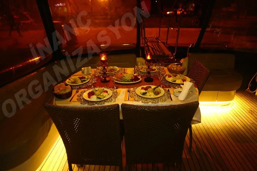 İnanç organizasyon kapsamında düşünülen bu tür programlarda teknede doğum günü nasıl yapılır? planlama ve tercih edilen tekne ve yat trafik durumunda aksaklık olur mu? gibi endişelerinizi aydınlatmak amacı ile kısaca bilgilendirmek istedik. Romantik bir akşam yemeği boğaz tadında sevdiğiniz müzikleri isteklerinize göre düzenleyerek yakın dost ve arkadaşlarınızın sayı durumuna göre tahsis edebileceğimiz tekne veya yatlarımızla belirttiğini renk ve görsellerde dekorasyon hazırlıklarımızı tamamlıyoruz. Talep ederseniz canlı orkestra ekiplerimizle klasik müzik, Türk sanat müziği, fasıl veya hareketli eğlenceli oyun havaları ile ön hazırlıklarımızı tamamlıyoruz.
